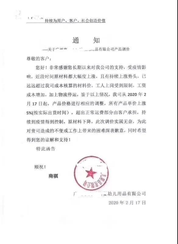 “3月1日起,旗下所有產(chǎn)品上調(diào)5%”,“產(chǎn)品價格進(jìn)行相應(yīng)調(diào)整,原有的價格體系取消”。所有產(chǎn)品單價上漲5%,超出正常運費部分由客戶承擔(dān),持續(xù)到疫情得到控制,原材料下降”