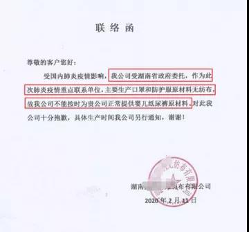 “受政委委托,作為此次疫情重點聯(lián)系單位,主要生產(chǎn)口罩和防護(hù)服原材料無紡布,不能按時正常提供嬰兒紙尿褲原材料”