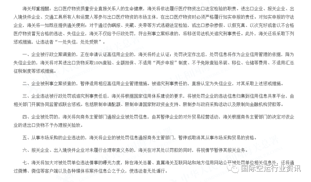 對于通過偽瞞報(bào)、夾藏、夾帶等方式逃避法定檢驗(yàn),或出口摻雜摻假、以假充真、以次充好或者以不合格醫(yī)療物資冒充合格的違法、失信企業(yè),海關(guān)不僅給予行政處罰,符合刑事立案標(biāo)準(zhǔn)的,將移送司法機(jī)關(guān)追究刑事責(zé)任。