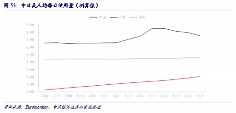 3.人均使用量的提升。伴隨著衛(wèi)生意識(shí)的提高,消費(fèi)升級(jí)趨勢(shì)以及嬰兒衛(wèi)生用品新產(chǎn)品的更新?lián)Q代,家長們會(huì)更加注重紙尿褲安全性與舒適感,不斷提高使用更換頻次。根據(jù)測(cè)算,日本市場出現(xiàn)波動(dòng)前每個(gè)適齡嬰幼兒(0-3歲)的每日使用量約為6.5片,美國市場的長期均值水平為4.5片/日;對(duì)比之下,盡管出現(xiàn)提升趨勢(shì),我國當(dāng)前的人均使用量為2片/日,較發(fā)達(dá)成熟市場存在較大差距,未來有望進(jìn)一步提升至4-6片/日的區(qū)間內(nèi)。