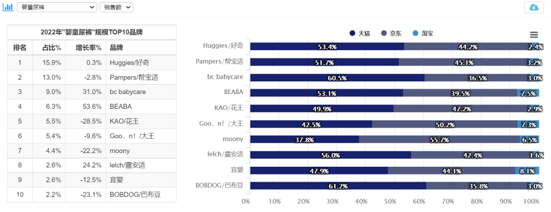 按照市場規(guī)模來看,2022年嬰童尿褲TOP10品牌分別為好奇、幫寶適、Babycare、碧芭寶貝(Beaba: )、花王、大王、Moony、露安適、宜嬰、巴布豆。