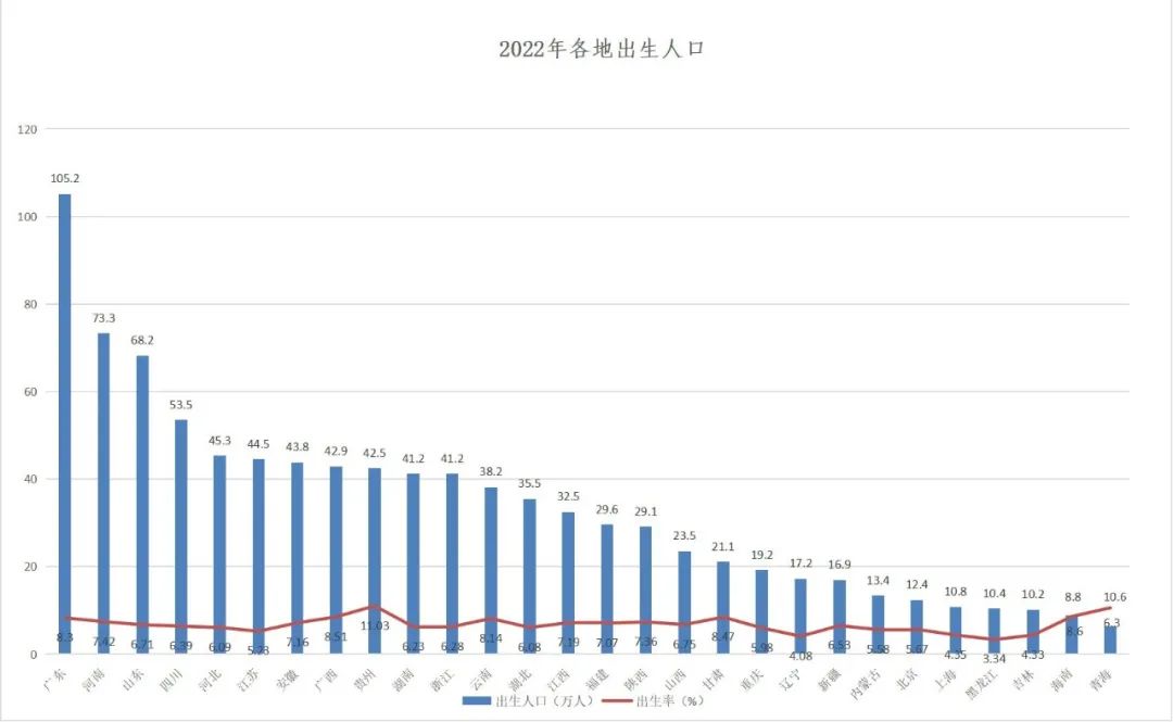 從部分經(jīng)濟(jì)欠發(fā)達(dá)地區(qū)看,出生人口同樣不容樂(lè)觀。以東北三省數(shù)據(jù)為例,2022年吉林出生人口為10.23萬(wàn)人,黑龍江出生人口10.39萬(wàn)人,遼寧出生人口17.2萬(wàn)人,三省出生人口合計(jì)跌破了40萬(wàn),僅為37.74萬(wàn)人,占全國(guó)比重僅為3.95%。常住人口合計(jì)超9600萬(wàn)的東北三省,去年出生人口不及西南的云南一省多。