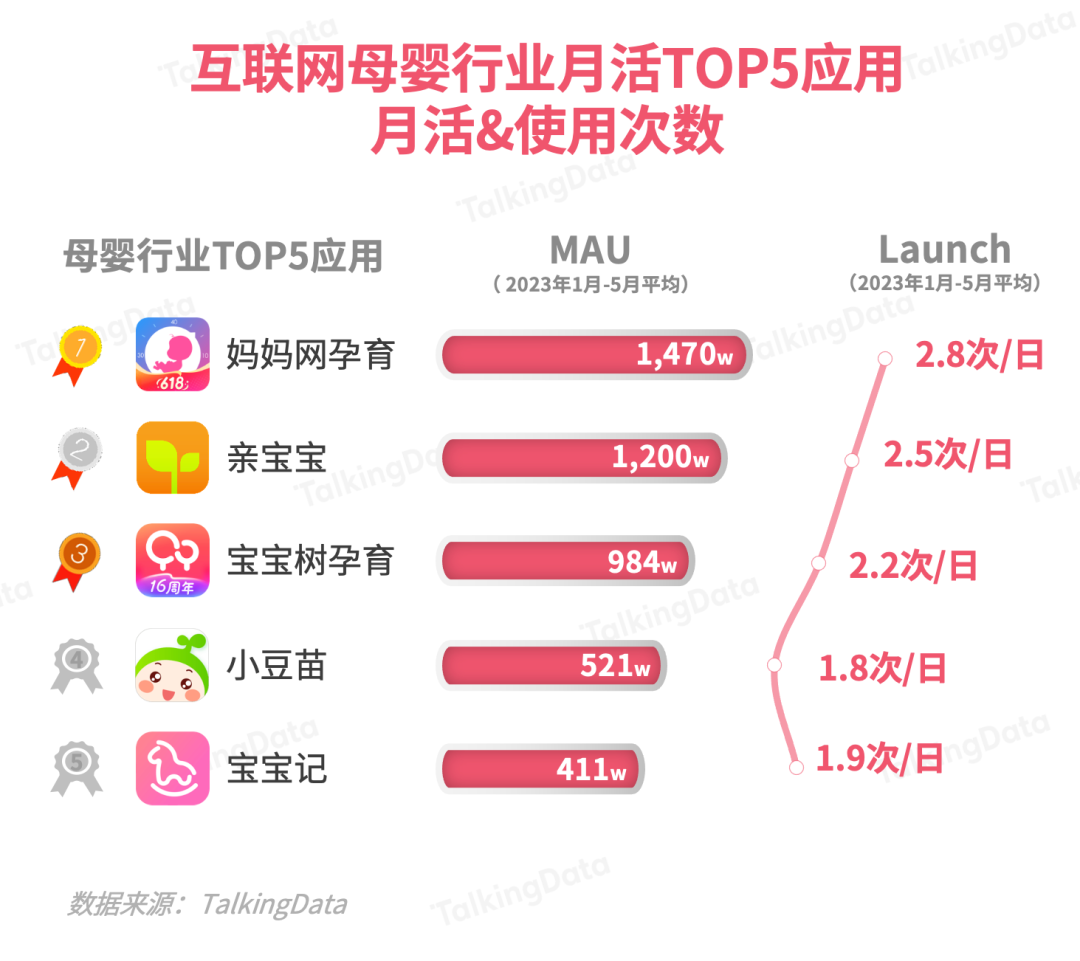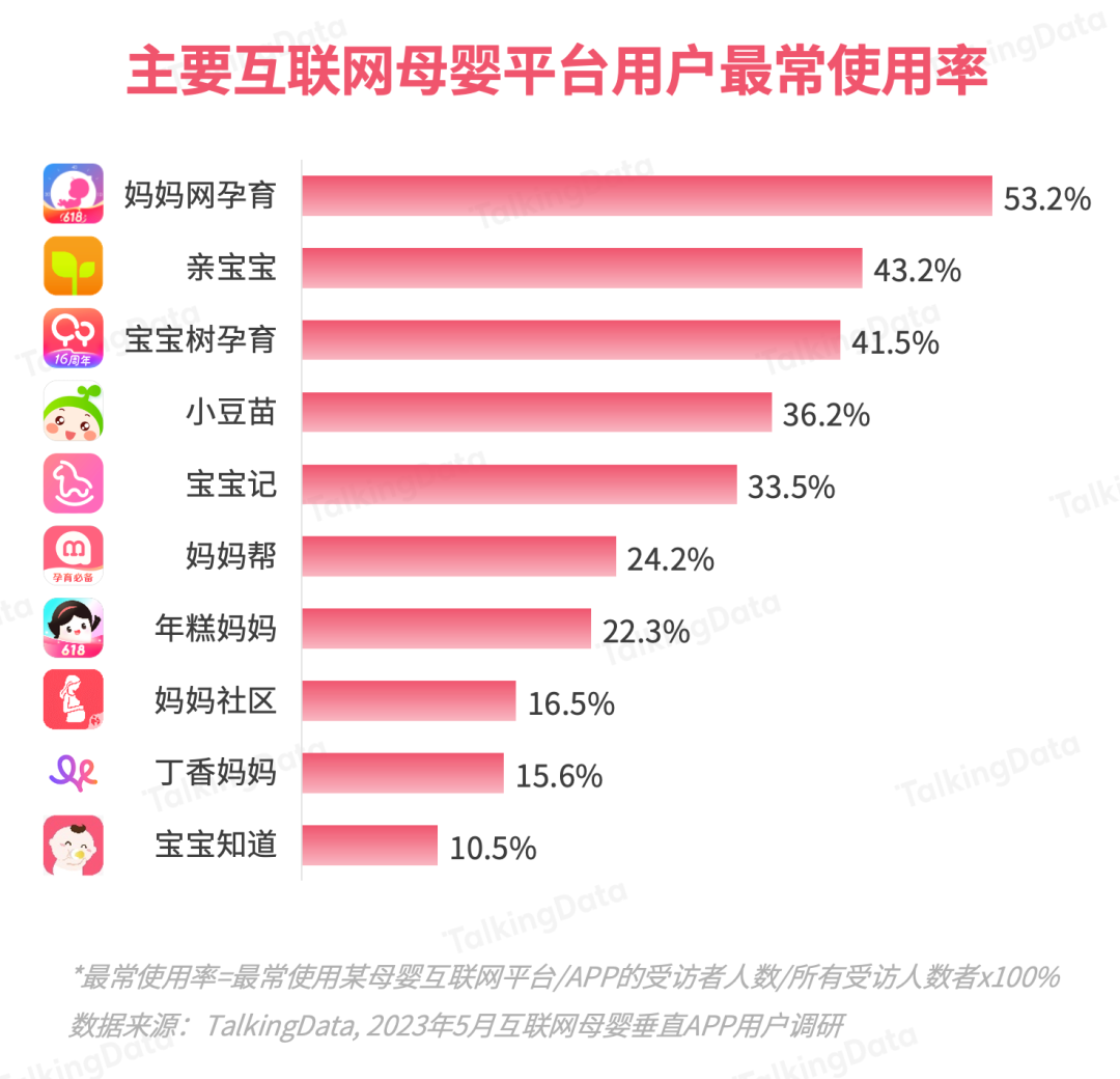基于TalkingData的母嬰行業(yè)應(yīng)用數(shù)據(jù)及2023 年5月的調(diào)研數(shù)據(jù),報告對主要互聯(lián)網(wǎng)母嬰平臺的月活、認(rèn)知、使用等數(shù)據(jù)進(jìn)行了統(tǒng)計分析。
