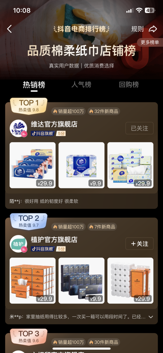 以生活用紙品牌維達為例,截至2023年7月25日,據(jù)抖音平臺直播動態(tài)顯示,維達官方旗艦店今年上半年累計直播場次已超過200場。從最新的抖音電商排行榜來看,維達官方旗艦店已經(jīng)在“品質(zhì)綿柔紙巾店鋪熱銷榜”上排名第一。而店內(nèi)居銷量榜首的爆品手帕紙更是售出達到253.6萬件。其中排名前五的品類分別為手帕紙、卷芯紙和抽紙,手帕紙獨占前三名。