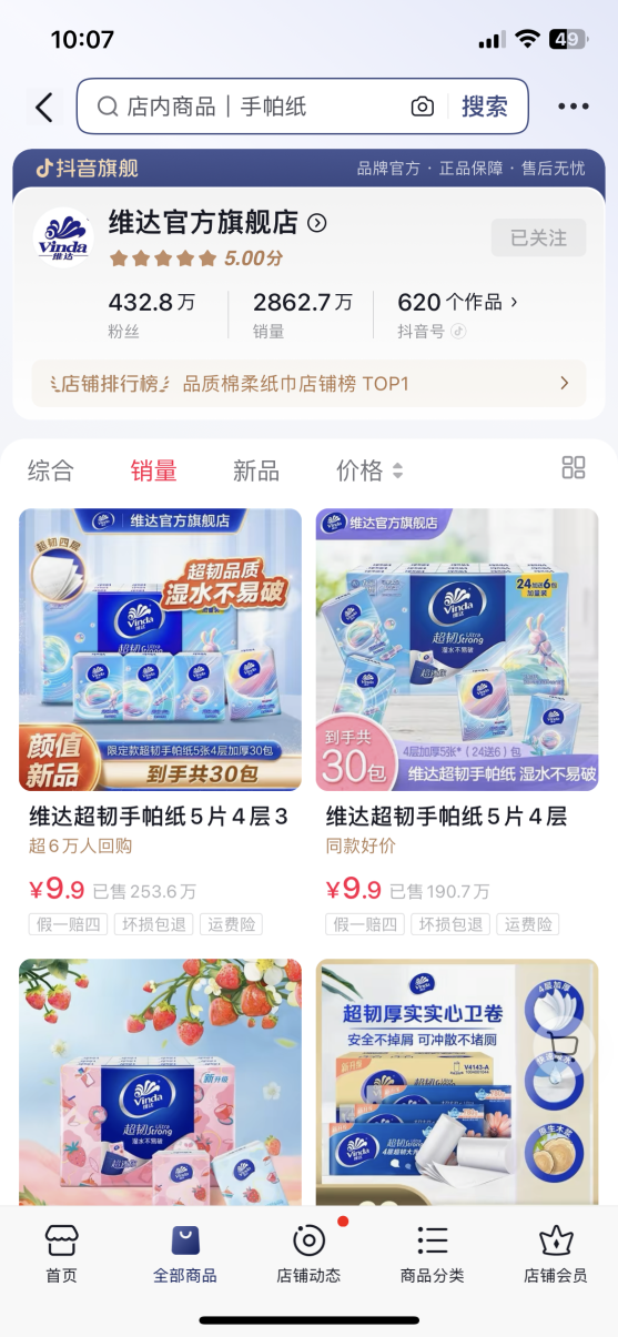 其中以抖音電商為例,維達在抖音設(shè)立的旗艦店已經(jīng)擁有粉絲432.8萬,累計獲贊138.5萬,并發(fā)布了620個推廣作品,對應(yīng)上架商品多達579件。