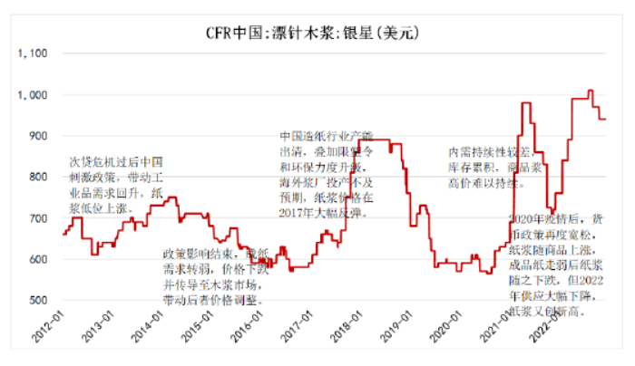 然而,針對木漿這一原材料,生活用紙企業(yè)非常被動。據(jù)方正中期期貨數(shù)據(jù)顯示,我們可以在下表的漂針木漿(銀星)CFR現(xiàn)貨價走勢中發(fā)現(xiàn),從2012年到2022年,木漿價格整體攀升幅度非常大,同時波動明顯。直到2022年,木漿現(xiàn)貨價格達到歷史高位。由此可見,生活用紙企業(yè)在囤積原材料方面壓力不小。