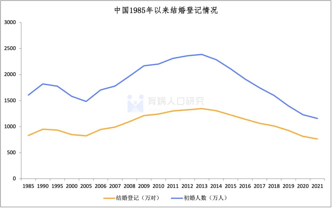 初婚人數(shù)在2013年達到2386萬人的峰值后持續(xù)下降,2021年下降到1158萬人,比2013年下降51.5%。2013年結(jié)婚登記對數(shù)為1347萬對,2022年結(jié)婚登記對數(shù)下降到683萬對,連續(xù)九年下降。